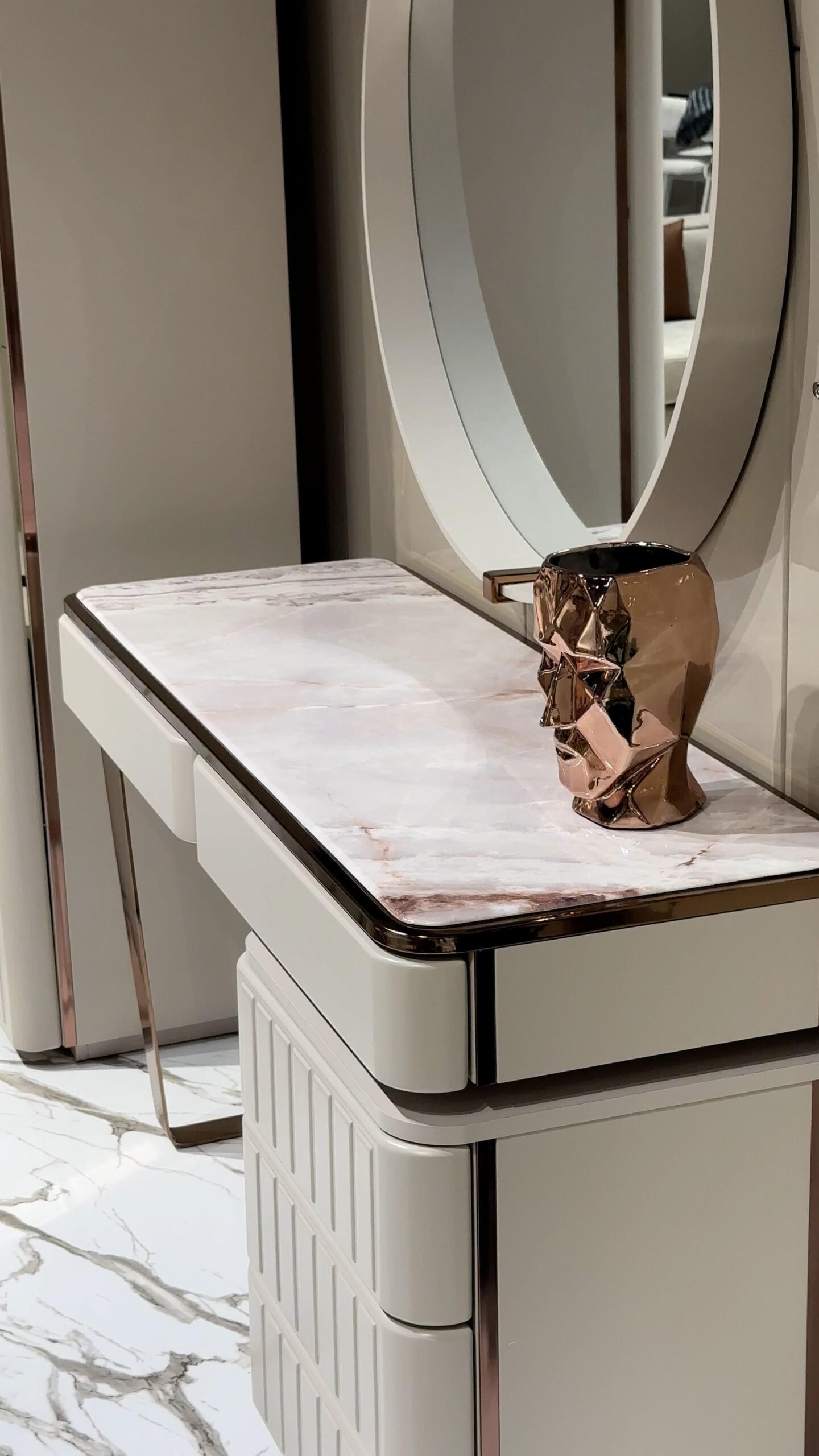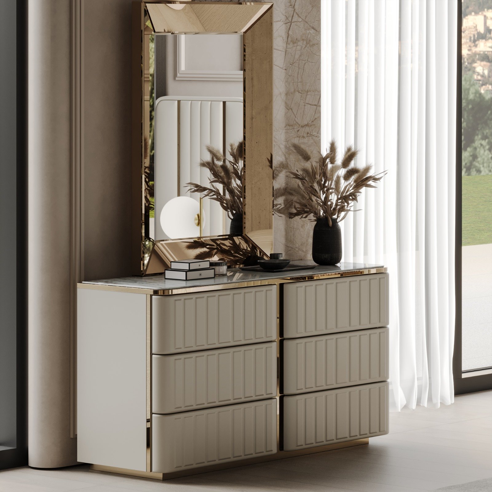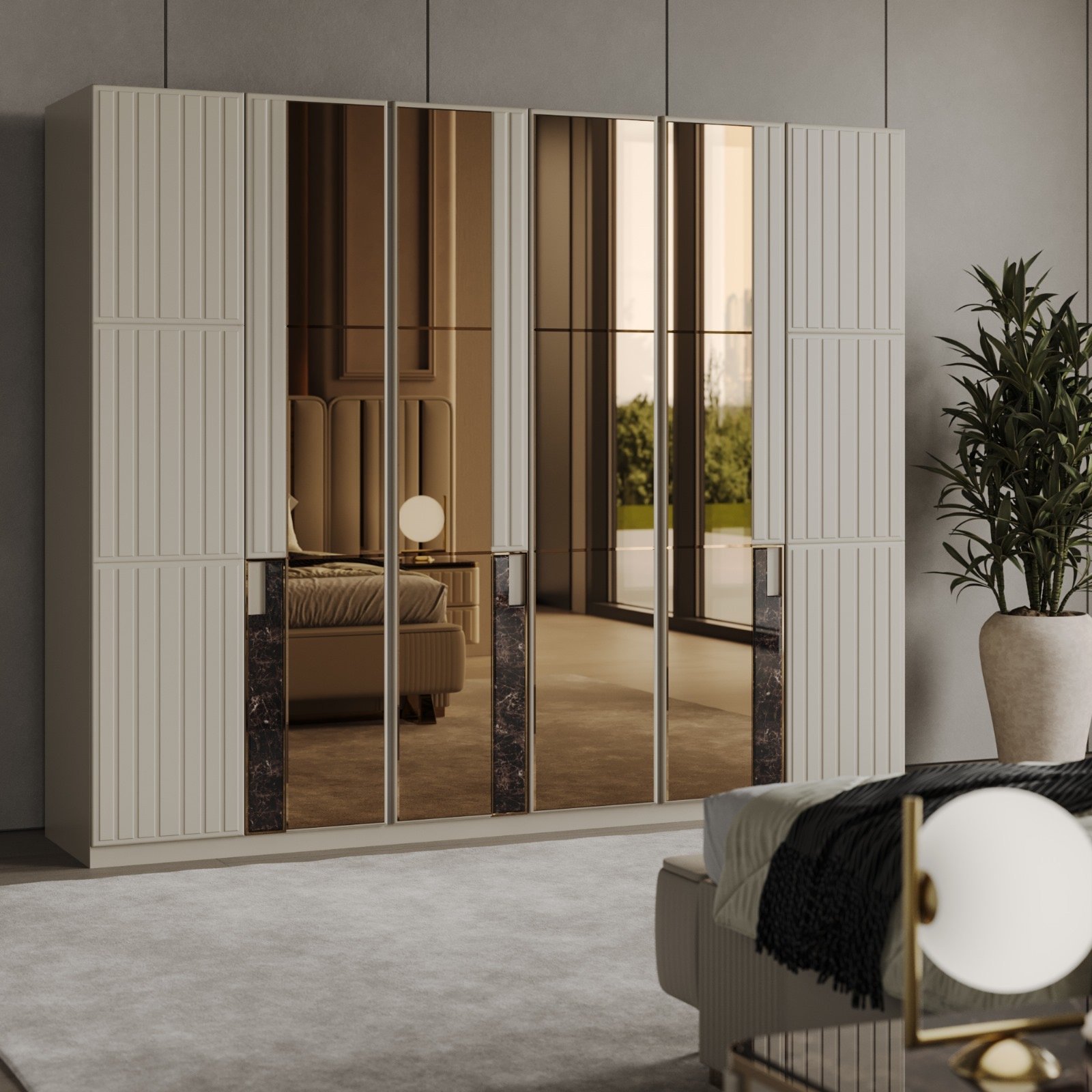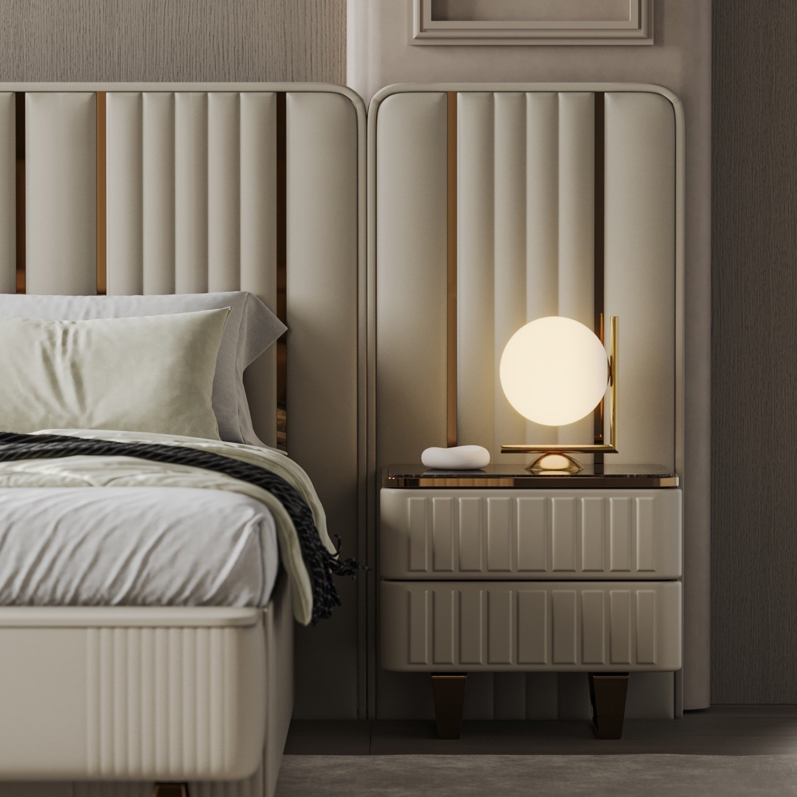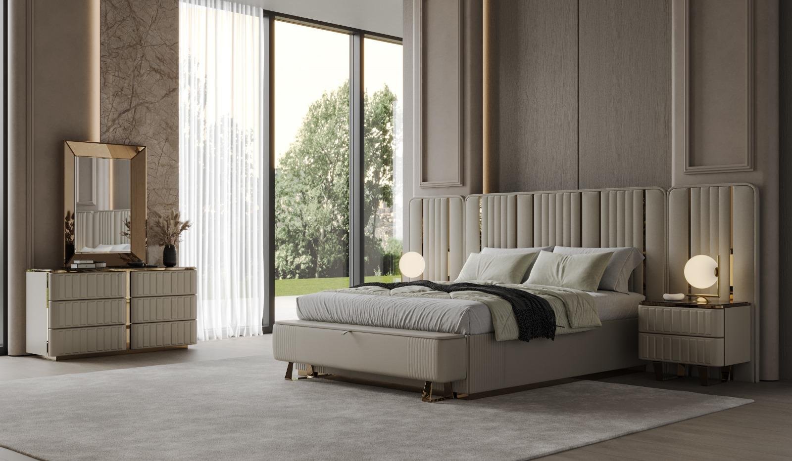 Karyola, gardırop, şifonyer ve komodinlerden oluşan bu takım; fonksiyonelliğiyle birlikte estetik bir uyum sunar. Ayna detayları, metal dokular ve özel tasarlanmış kulplarıyla mekâna sofistike bir hava katar.